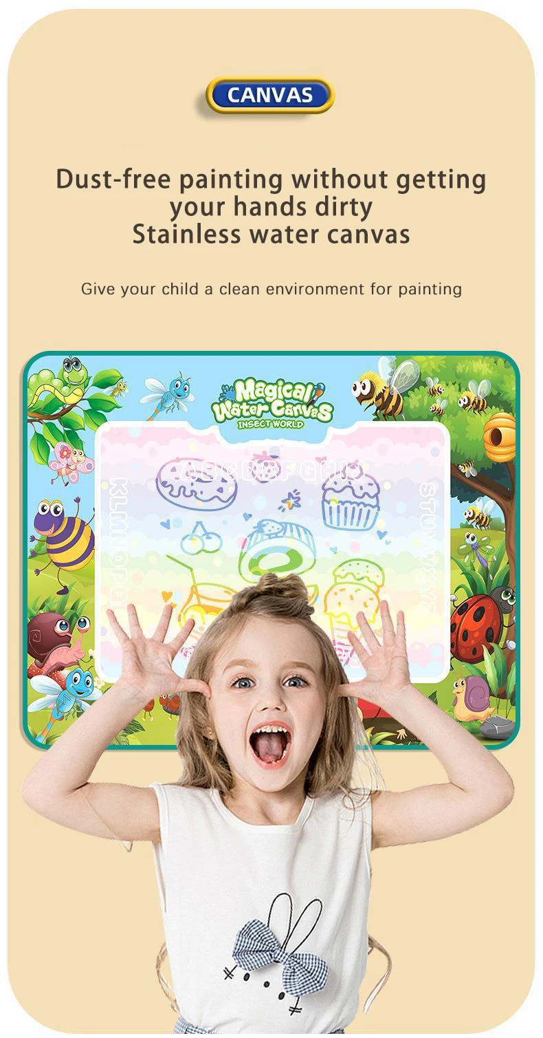 Description: Doodle mat takes No ink or paint and is SAFE for your children. This drawing mat helps to find a creative way to develop writing and painting skills. Help to improve kids' creativity and imagination as well, exercise hand-eye coordination & the color perception ability. This magical water painting pad allows your child to paint with friends on the table or floor, exercise hand-eye coordination and color perception, develop painting and creative skills. No ink, No paint, Non-toxic, Non-polluting.The back of the mat is water-resistant nylon material,clean and safety for kids. 【Package Include】: 100*80 canvas x1 Brush x3; EVA Templates x6 Picture Album x1 Water box x1